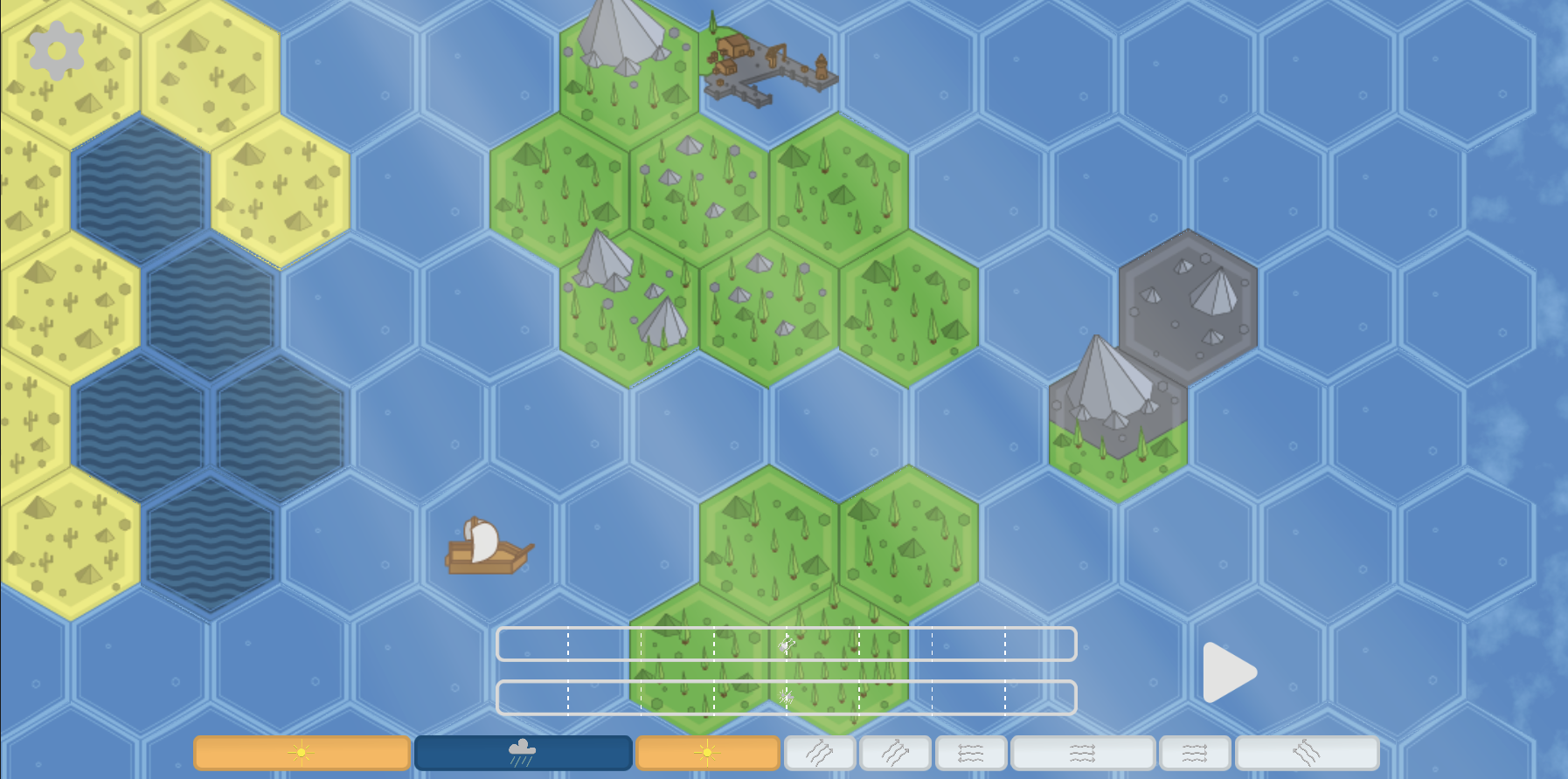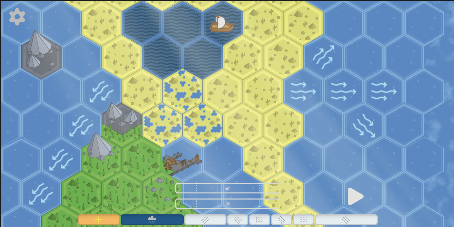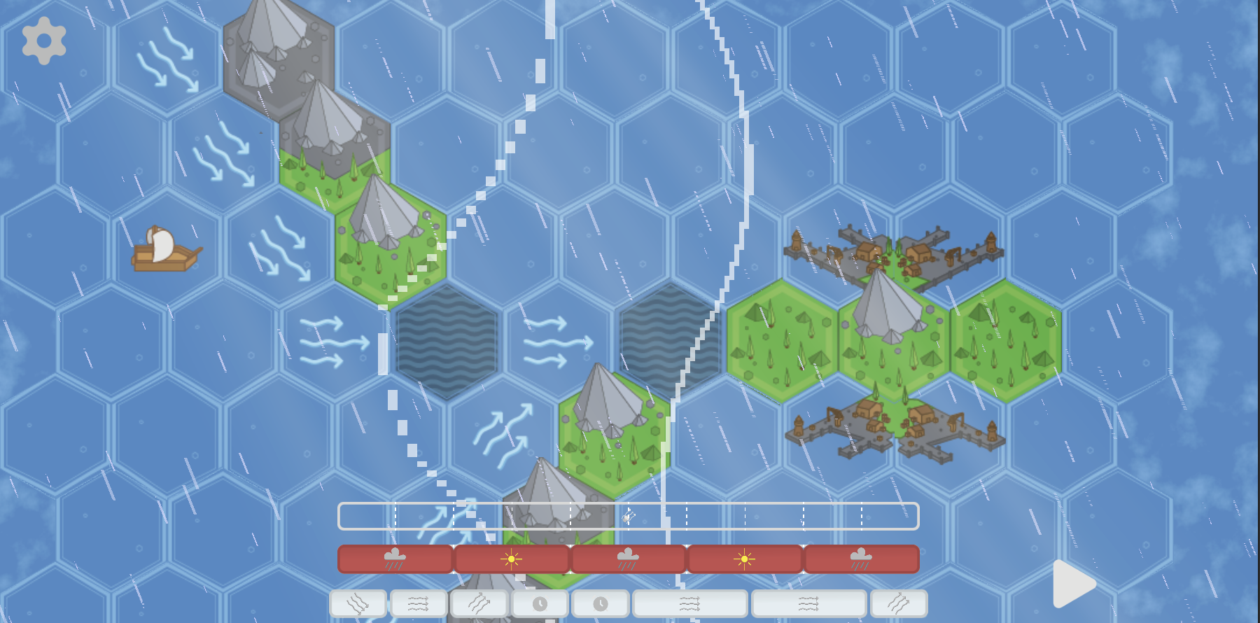 - Choose weather actions from the panel (sun or rain) and select the direction your ship should move to reach the harbor using the direction of the wind.